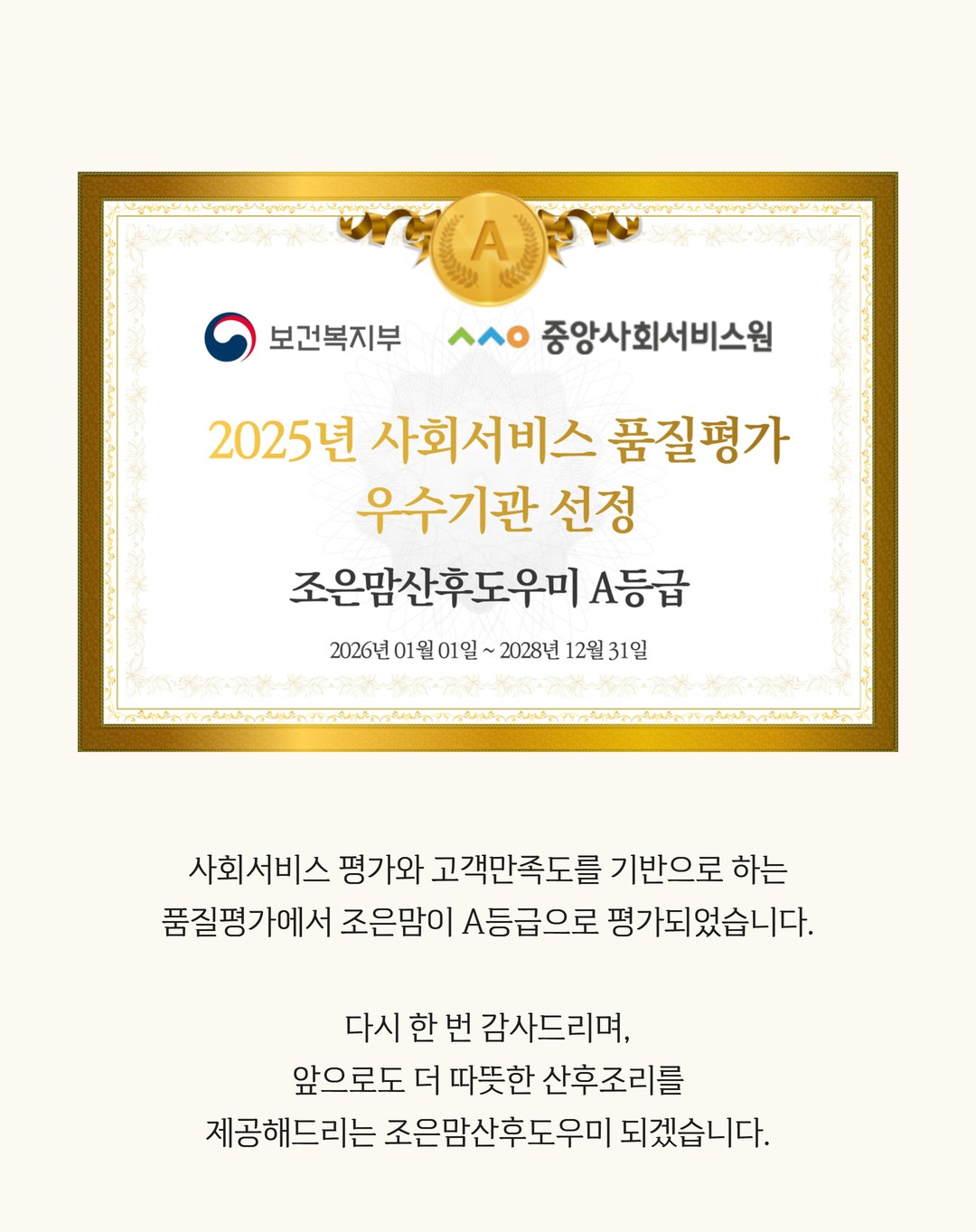 경축!! 조은맘산후도우미. 보건복지부 서비스품질평가 다수기관 A등급 선정