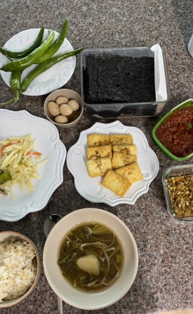 깻잎참치두부전 미역국 꼬막무침 오징어볶음