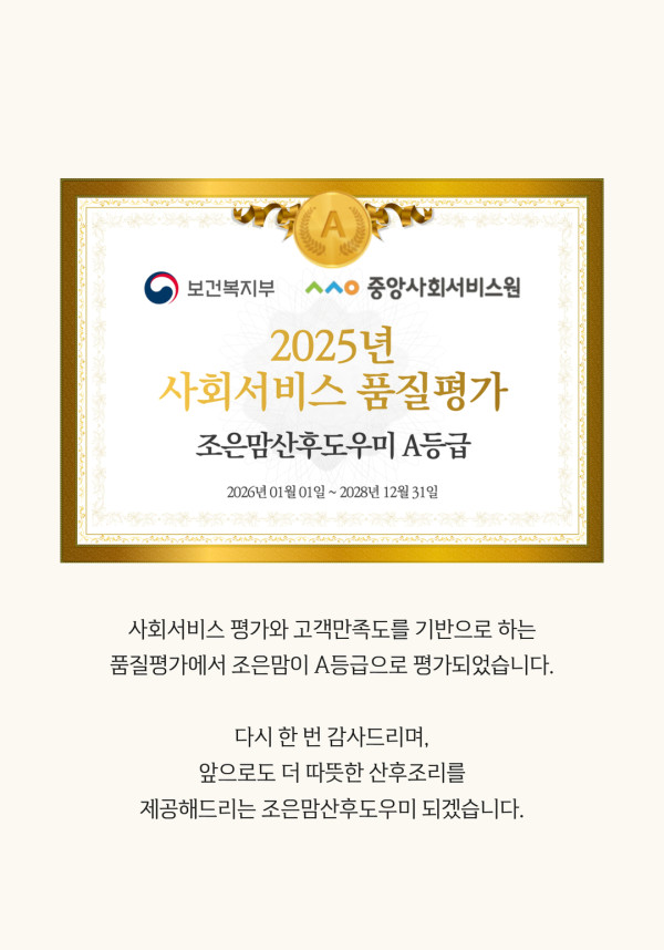 (경축) 조은맘 산후도우미 광주점 사회서비스 품질평가 우수기관 선정 및 다수 조은맘 지점 A등급 선정